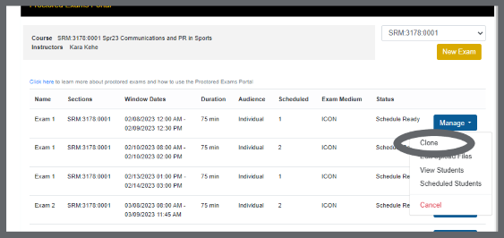 Clone is one of the drop down options you will find when you select the blue Manage button. Cloning a proctored exam request means making a nearly exact copy of a previously submitted proctored exam request.