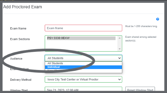 Choose Individual if a single student or a select group of students will be taking the exam. Typically, these are students who have SDS accommodations that can be administered at a campus test center, or who may need to take exams outside the standard exam window, (e.g., a make-up exam due to illness).