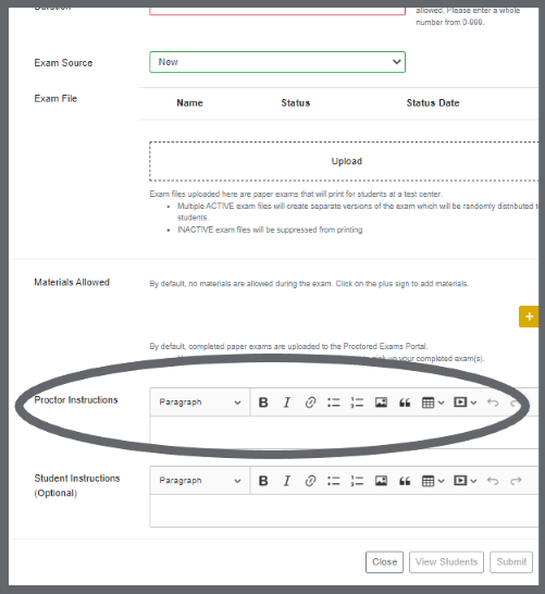 Student Instructions refers to the text box where you enter information that students need to know to take your exam. This field does NOT need to include items such as exam duration or materials allowed as these items are included elsewhere in the proctored exam request. This field can include things like special exam instructions that may not be included within your exam.